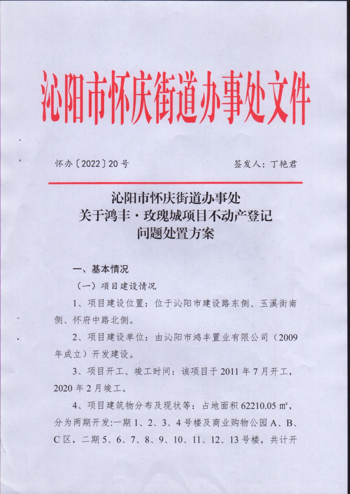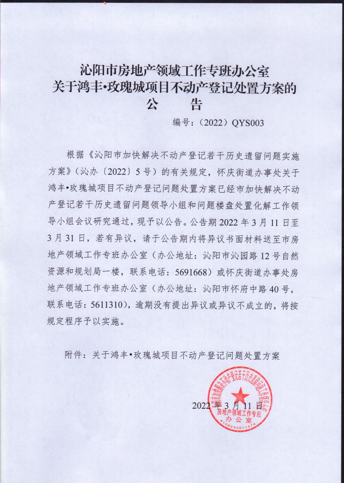 关于鸿丰·玫瑰城项目不动产登记处置方案的公告