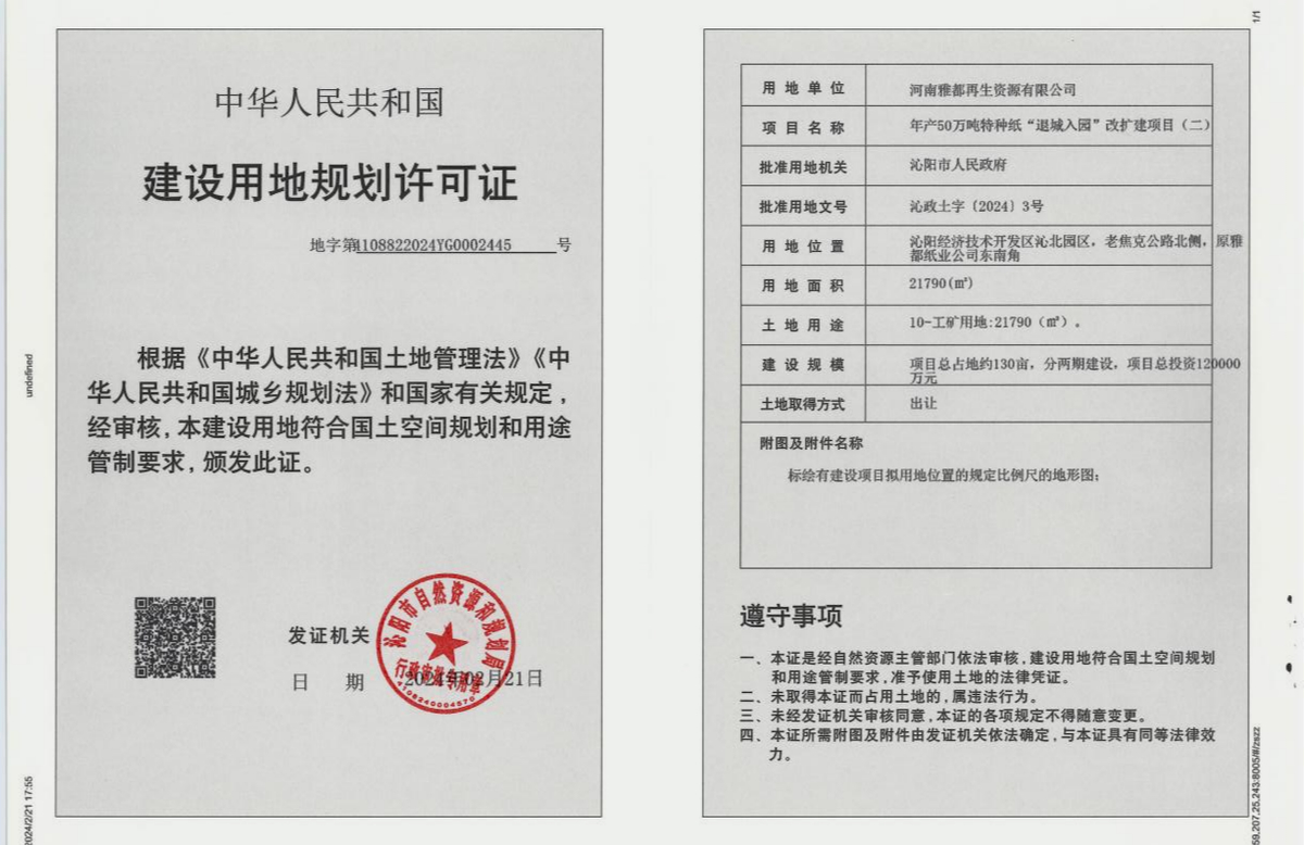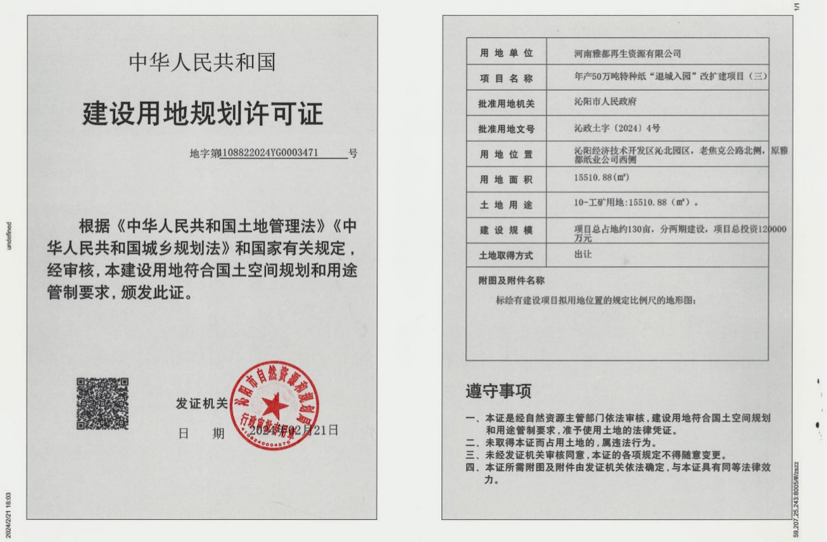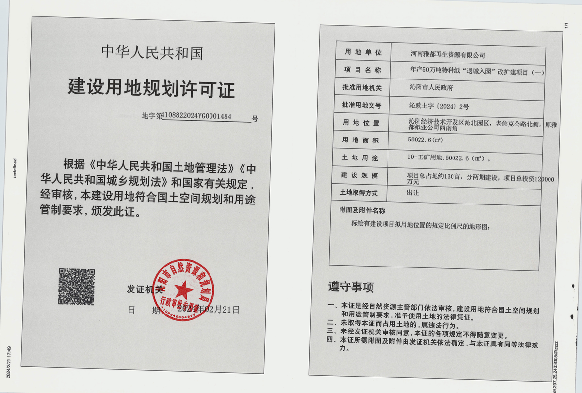 项目名称:年产50万吨特种纸“退城入园”改扩建项目。用地单位:河南雅都再生资源有限公司。批准用地机关:沁阳市人民政府。批准用地文号:沁政土字〔2024〕2、3、4号。用地位置:沁阳经济技术开发区沁北园区,老焦克公路北侧,原沁阳市雅都纸业有限公司南侧和西侧。用地面积:地块一50022.6平方米、地块二21790平方米、地块三15510.88平方米。土地用途:工业用地。建设规模:项目占地约130亩,分两期建设。总投资120000万元。土地取得方式:国有土地使用权出让。许可证序号:地字第4108822024YG0001484号、地字第4108822024YG0002445号、地字第4108822024YG0003471号。许可日期:2024年2月21日。