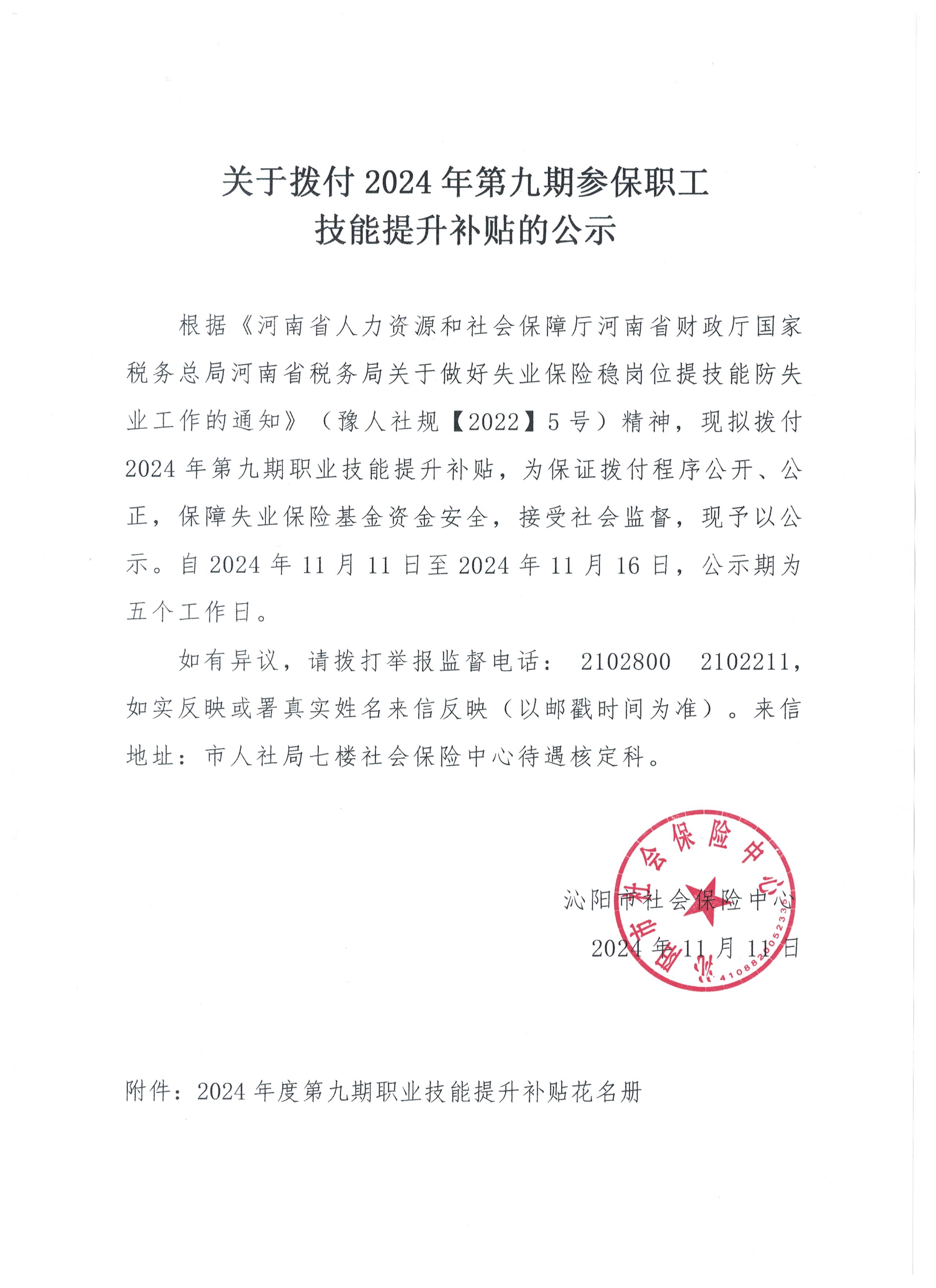 关于拨付2024年第九期参保职工技能提升补贴的公示