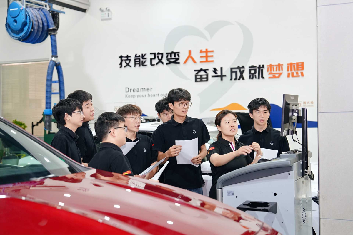 郑州职业技术学院汽车综合实训中心,教师正带着学生实训。