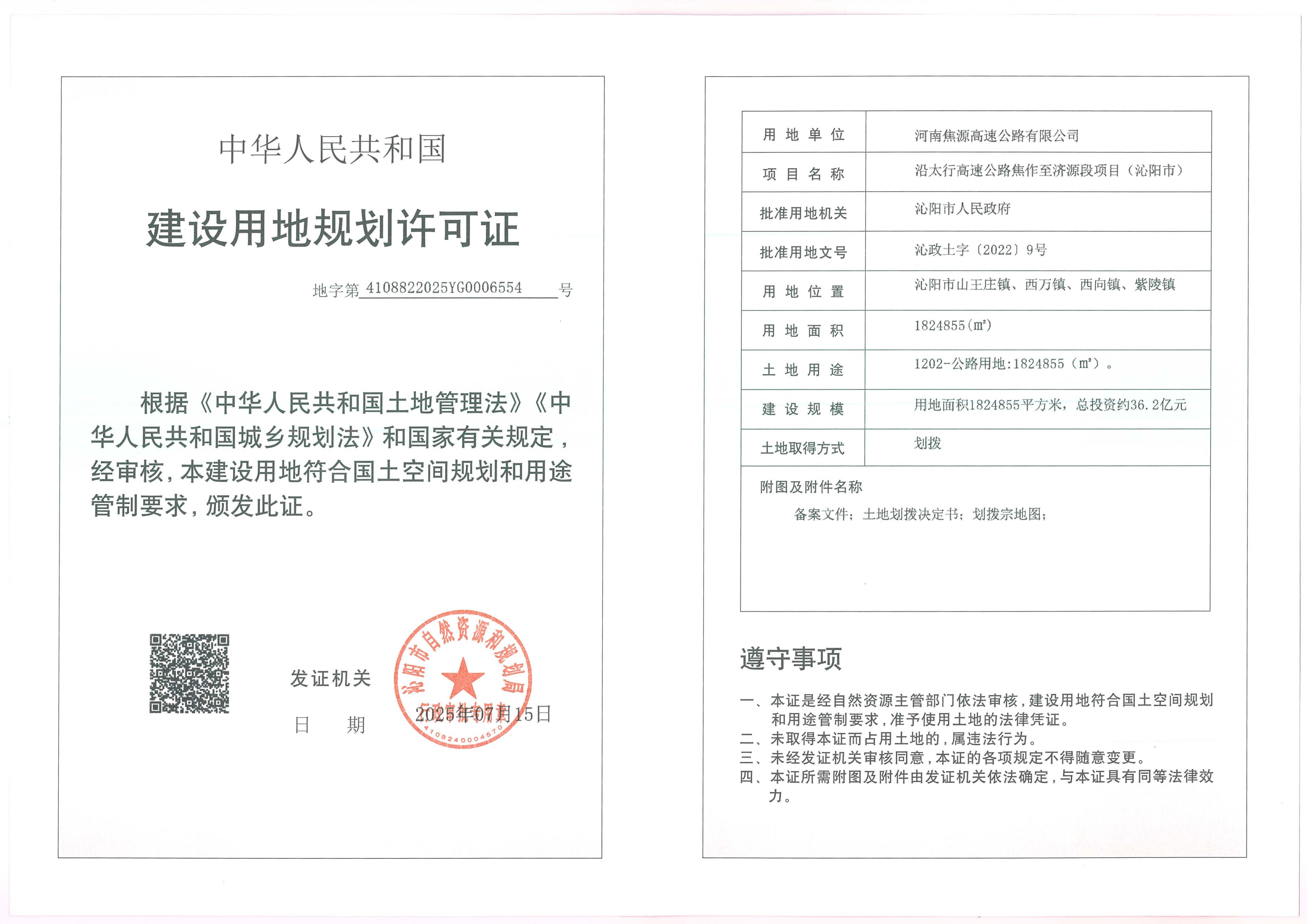 河南焦源高速公路有限公司 沿太行高速公路焦作至济源段项目(沁阳市) 建设用地规划许可
