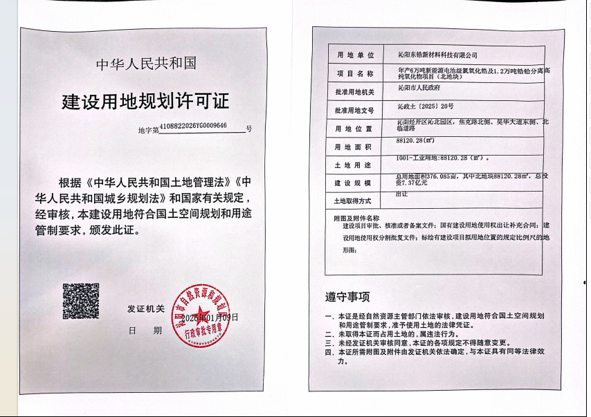 沁阳东锆新材料科技有限公司年产6万吨新能源电池级氯氧化锆及1.2万吨锆铪分离高纯氧化物项目(北地块)建设用地规划许可